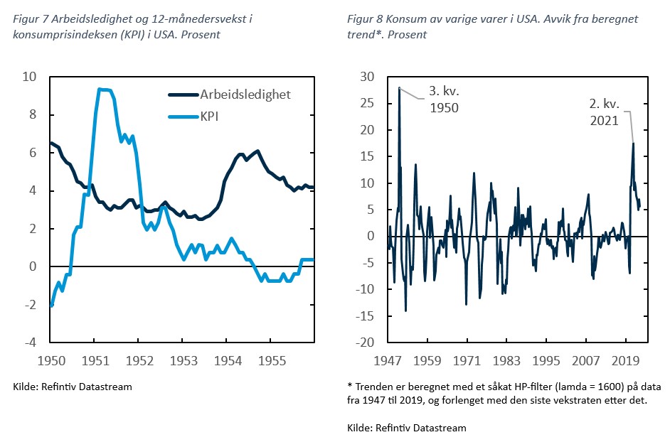 Tiden vil vise hvor krevende det vil bli for sentralbankene å få prisveksten helt tilbake på målene. Hvis pessimismen fra 2022 var overdreven, kan det også være at pendelen har svingt for langt motsatt retning i det siste. Om prisveksten skulle komme ned uten høy arbeidsledighet vil det imidlertid ikke være helt uten sidestykke historisk. Det samme skjedde under Korea-krigen tidlig på 1950-tallet, se figur 7. Dette var selvfølgelig en helt annen tid, men det er likevel noen likhetstrekk til den aktuelle situasjonen. Også den gang var sterk vekst i kjøpene av varige forbruksvarer – drevet av frykt for rasjonering i etterkant av krigsutbruddet i juni 1950 - en viktig grunn til den høye prisveksten i USA, se figur 8. Politikktiltakene som ble iverksatt - pris- og lønnsregulering, skatteøkninger og en noe strammere pengepolitikk – var imidlertid tilstrekkelig til å få ned prisveksten til rundt 2 prosent allerede første halvår av 1952. Det var først etter at krigen var avsluttet i 1953 at arbeidsledigheten økte, og da ble prisveksten etter hvert negativ.