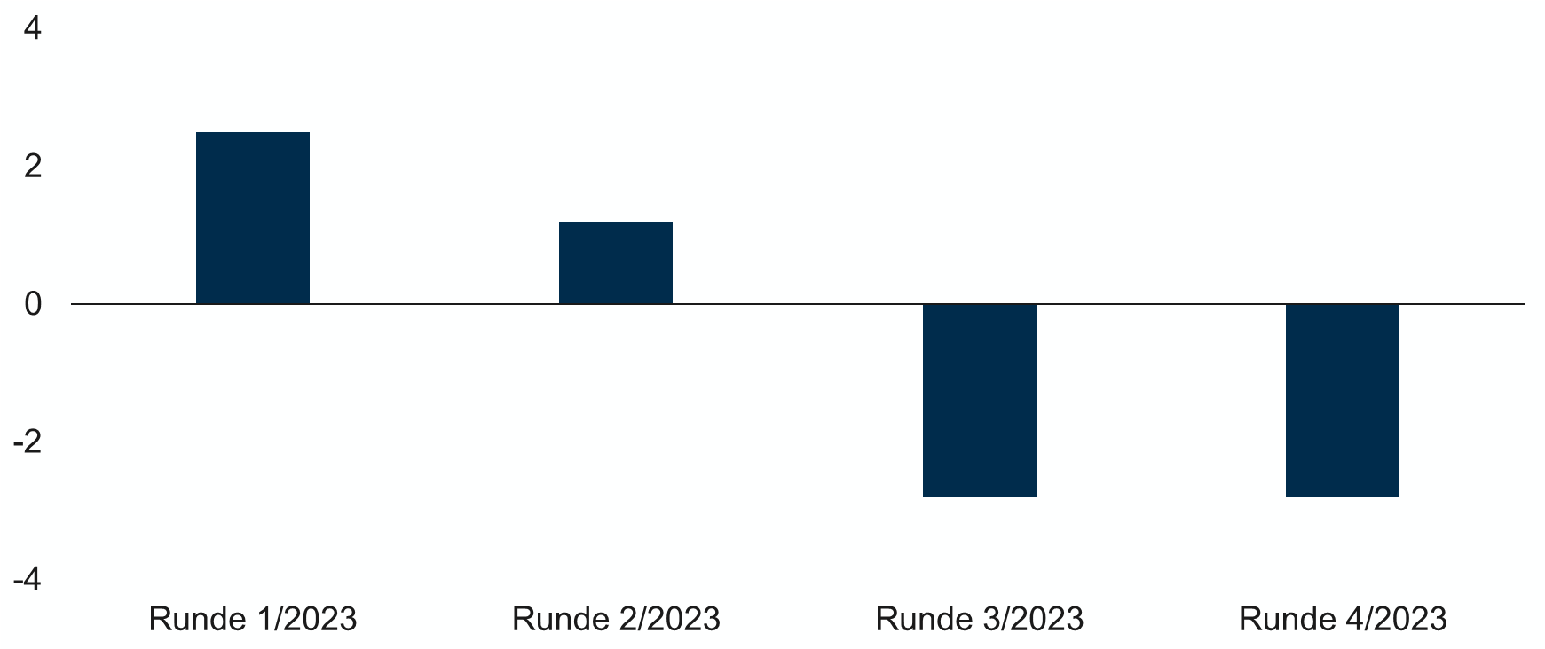 Resultatene indikerer at de finansielle forholdene for bedriftene har blitt strammere utover det som følger av at finansieringskostnadene har økt: En tidel av dem har kuttet i investeringsplanene på grunn dårlig tilgang på finansiering, mens halvparten så mange har justert planene opp som følge av at tilgangen på finansiering er bedret. Det er særlig bedrifter innen bygg og anlegg som melder at dårlig tilgang på finansiering har bidratt til å redusere de planlagte investeringene.