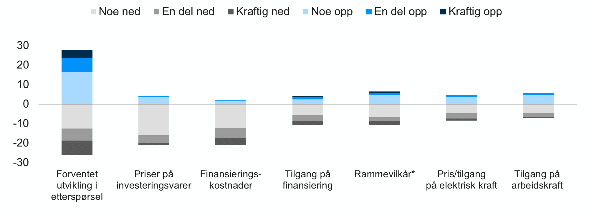 Norske bedrifter har de siste årene stått overfor endrede politiske rammevilkår, høye og variable strømpriser og manglende tilgang på elektrisk kraft til nye prosjekter. En femdel av industribedriftene i utvalget har kuttet i investeringsplanene som følge av svekkede eller utilstrekkelige rammevilkår, herunder manglende støtte fra virkemiddelapparatet. Flere av dem er – direkte eller indirekte – påvirket av den nye grunnrenteskatten på havbruk eller endringene i CO2-kompensasjonsordningen i de to siste statsbudsjettene. Nesten en femdel av industribedriftene har dessuten kuttet i planene for de samlede investeringene på grunn av høy strømpris eller manglende tilgang på elektrisk kraft. Langt færre av dem har oppjustert planene som følge av endringer i kraftsituasjon eller andre rammevilkår. Slike forhold har samlet sett ikke endret investeringsplanene i de andre sektorene i særlig grad.