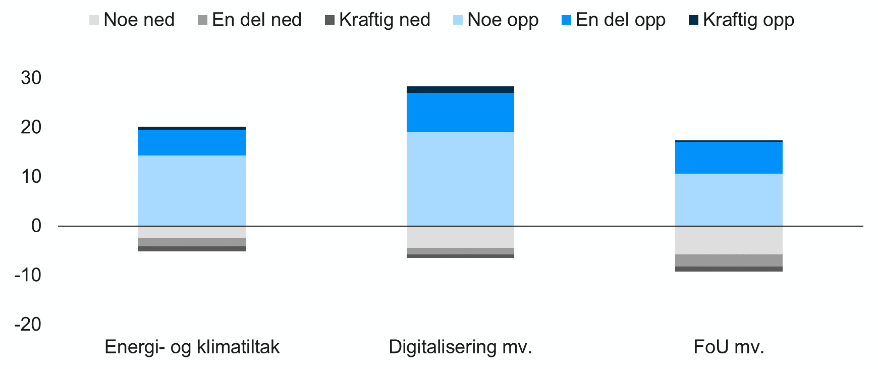 Bedriftene har også økt sine planlagte investeringer i FoU mv. og digitalisering mv. (herunder kunstig intelligens). Slike investeringer står for en betydelig og økende del av bedriftenes investeringer ifølge tall fra nasjonalregnskapet; se også Haaskjold (2018) og Xu (2019). Nesten tre av ti bedrifter i utvalget har oppjustert sine planer for investeringer i digitalisering mv. siden høsten 2022, mens få har kuttet i planlagte digitaliseringsprosjekter. Dette har nok sammenheng med den rivende utviklingen innen kunstig intelligens. Den sterke kostnadsveksten har dessuten stimulert bedriftene til å effektivisere driften gjennom digitalisering. Nesten en femdel av bedriftene har økt de planlagte investeringene innen FoU mv. Det er dobbelt så mange som de som har kuttet i planene for slike investeringer.