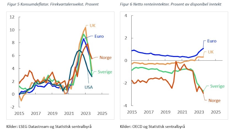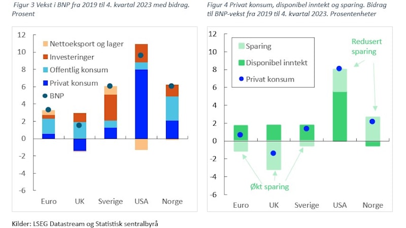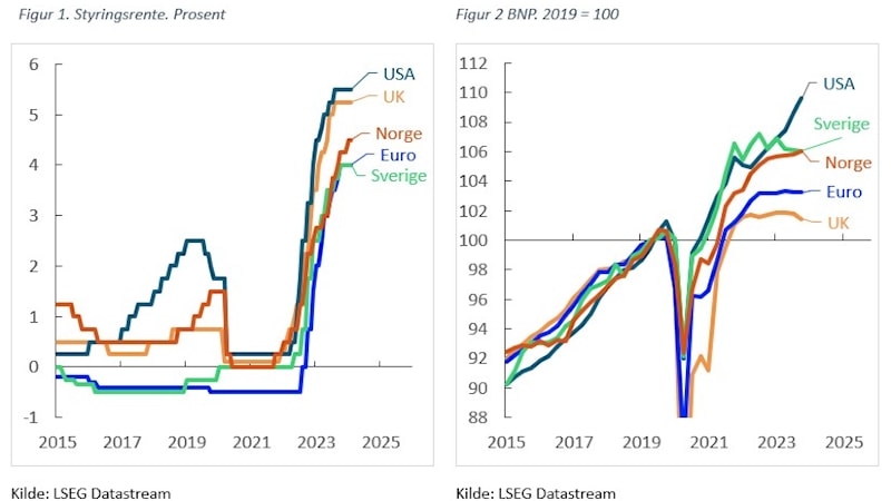 Mens den økonomiske aktiviteten i det siste har flatet ut eller falt i europeiske land, har veksten til tross for høyere renter holdt fram i godt tempo i USA. Det er særlig det private konsumet som har utviklet seg sterkere i USA. Amerikanske husholdninger har både hatt høyere inntektsvekst og i større grad brukt av sparepengene fra pandemien. Produktivitetsveksten har også vært klart høyere enn i Europa. Det er ikke noe nytt at USA vokser fra landene i euroområdet, men Norge og Sverige har tidligere holdt bedre følge.