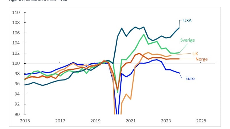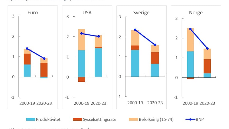 Produktivitetsforskjeller har gjennomgående vært den viktigste kilden til forskjeller i BNP-utviklingen. Produktivitetsveksten i USA, Sverige og Fastlands-Norge var svært lik og om lag dobbelt så høy som i euroområdet i de to første tiårene av dette århundret. Til tross for ulik befolkningsvekst var veksten i sysselsettingen mer lik. At en økende andel av befolkningen kom i jobb, veide opp for lavere befolkningsvekst i euroområdet og Sverige.