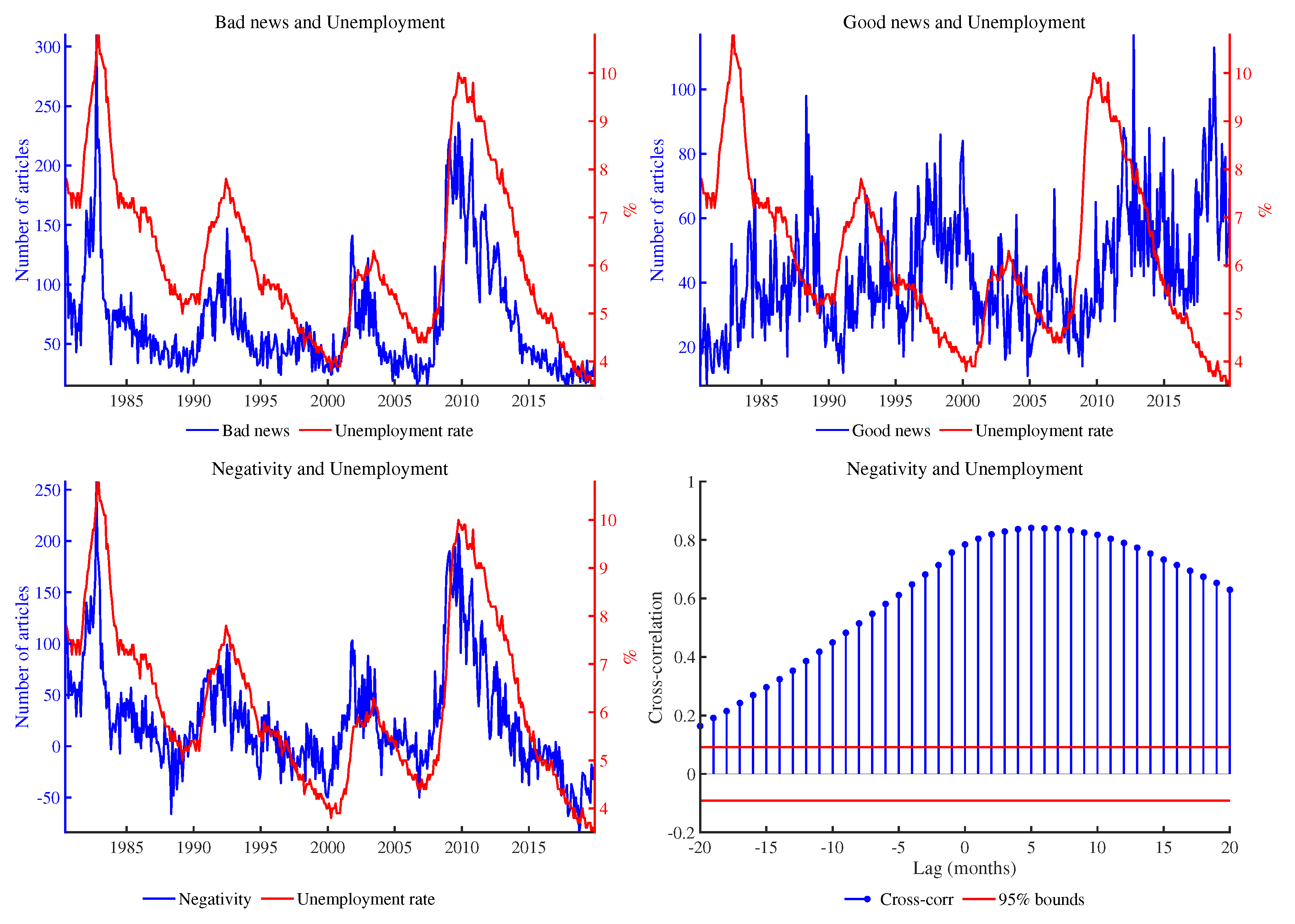 Figure 1 plots monthly counts of bad news (articles mentioning rising or high unemployment), good news (articles mentioning falling or low unemployment), and their difference - negativity - together with the unemployment rate. Several clear patterns emerge: