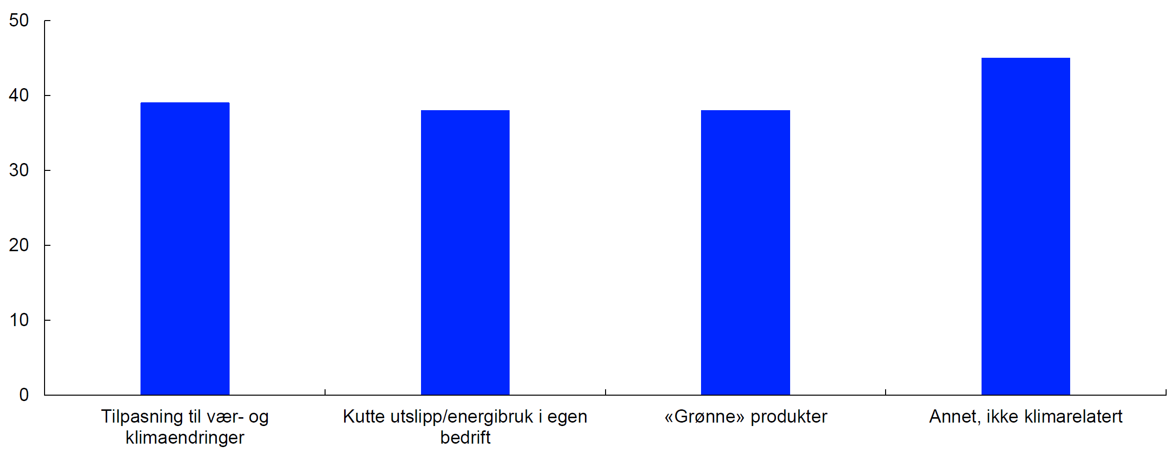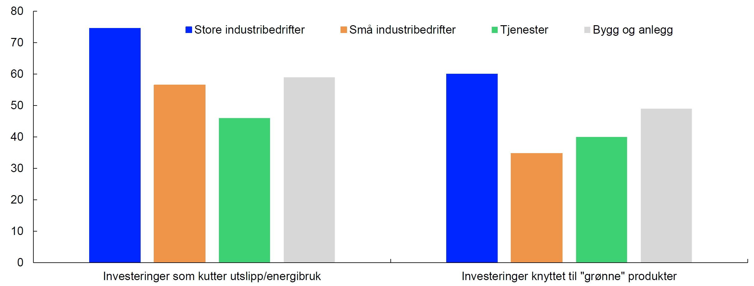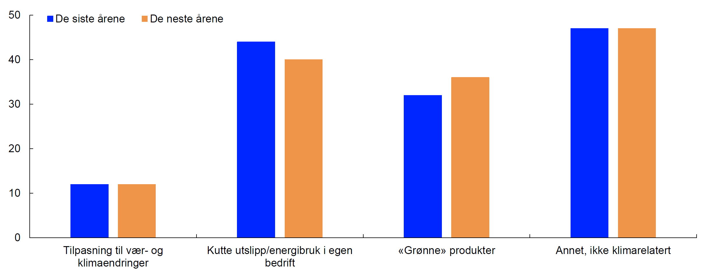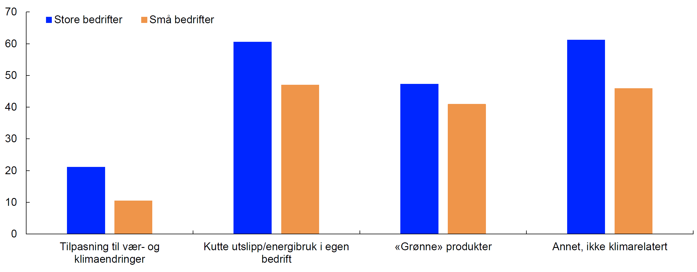 Note: Svarene er målt i prosent av antall bedrifter som har investert i klimarelaterte prosjekter de siste årene og/eller planlegger å gjøre det de neste årene.