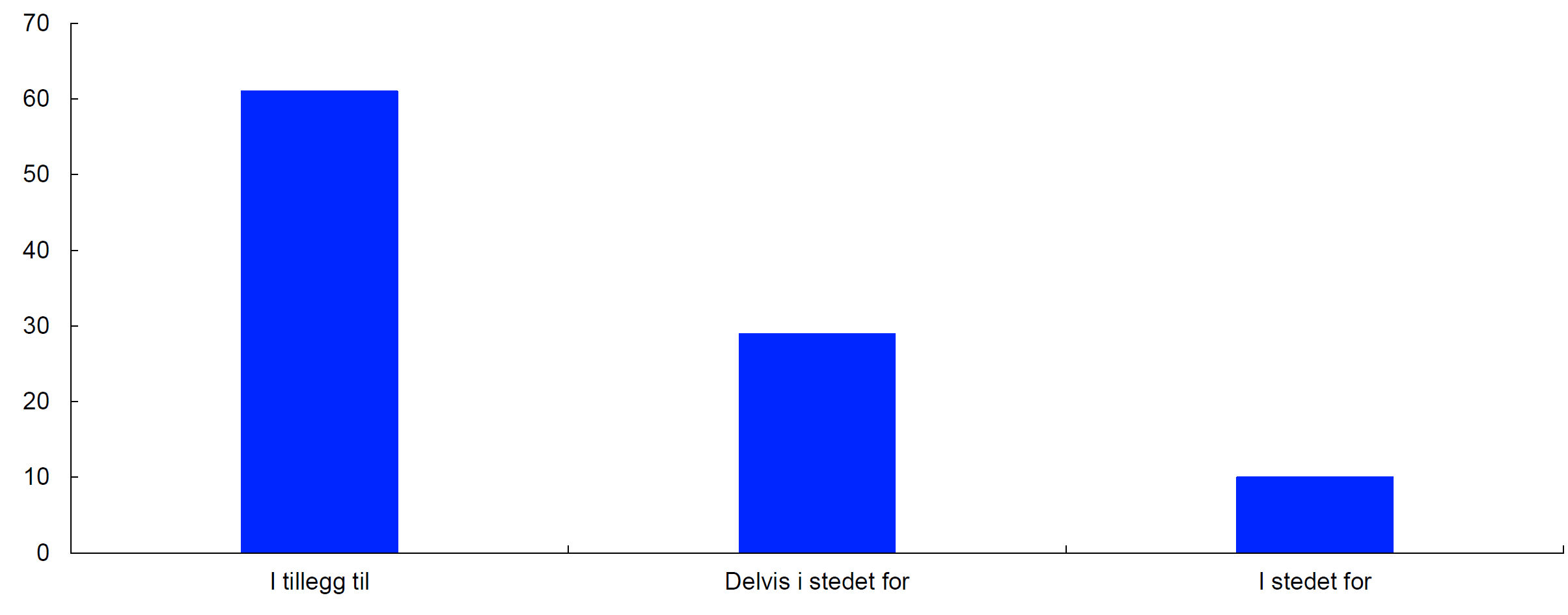 Over 60 prosent av bedriftene som investerer i klimarelaterte prosjekter, sier at disse prosjektene kommer i tillegg til andre investeringer, se figur 4. Nær 30 prosent sier at investeringene i klimarelaterte prosjekter delvis kommer istedenfor andre investeringer, mens kun 10 prosent melder at de klimarelaterte prosjektene fortrenger andre investeringer fullt ut. Selv om vi ikke får tatt hensyn til at investeringer i én bedrift kan fortrenge investeringer i andre bedrifter, tyder svarene på at klimaomstillingen bidrar til høyere investeringer i fastlandsbedriftene.