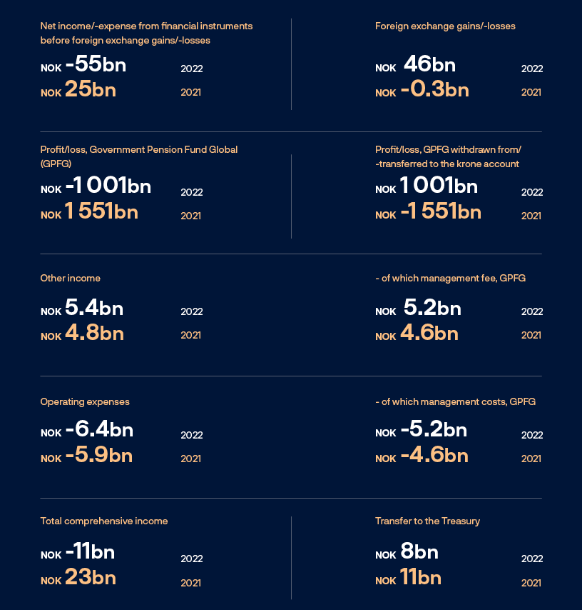 - In accordance with the guidelines, the net profit of NOK -11.1bn is to be transferred as follows: NOK -13.2bn will be transferred from the Adjustment Fund and NOK 2.1bn to the Transfer Fund. From the Transfer Fund, one-third, or NOK 8.1bn, will be transferred to the Treasury.