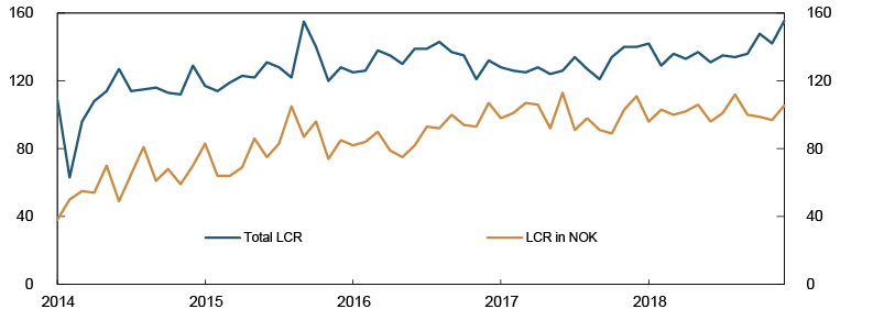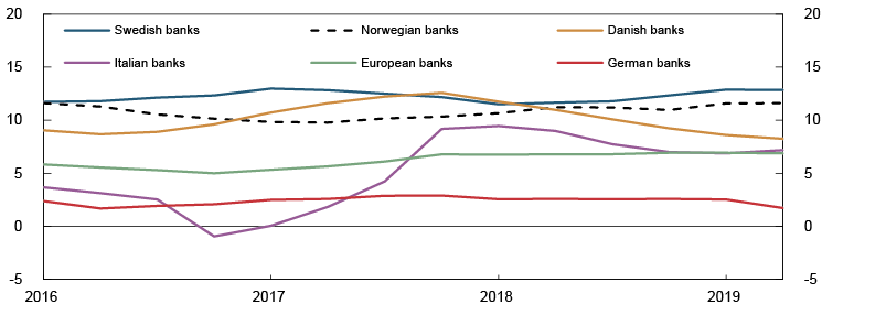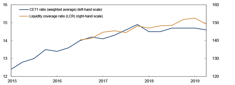 The European market is particularly important for the Norwegian economy. The situation at European banks is important for the European economy and may affect Norwegian banks’ funding markets. On the whole, European banks’ capital adequacy and liquidity coverage have improved considerably in recent years (Chart 1.1), but there are large differences across countries. The build-up of loss absorbency capacity appears to have come to a halt, and the average leverage ratio is lower for European banks than for Norwegian banks.1