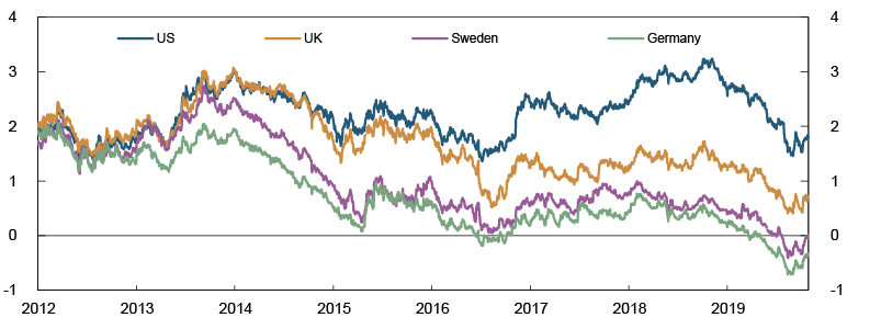 Chart 1.2 Yields on ten-year government bonds in selected countries Percent. 1 January 2012 – 30 October 2019