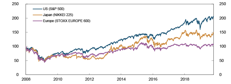Chart 1.3 Stock market indexes in selected countries Index. 1 January 2008 = 100. 1 January 2008 – 30 October 2019