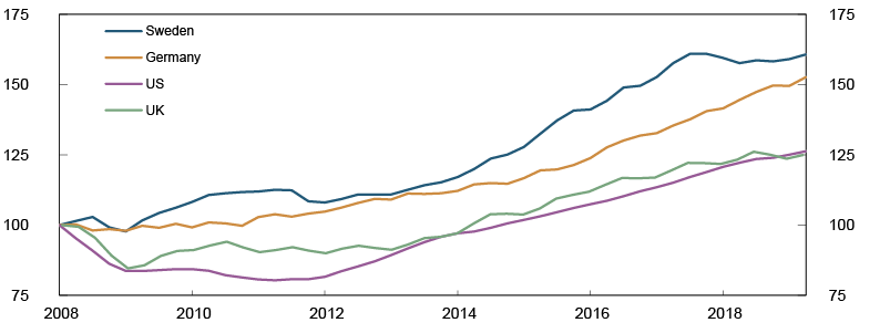 Chart 1.4 House prices in selected countries Index. 2008 Q1 = 100. 2008 Q2 – 2019 Q2