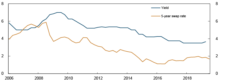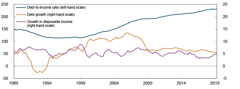 Financial system vulnerabilities in Norway have not changed substantially since the previous Report, which was published in October 2018. Household debt is high, and commercial and residential property prices are at high levels after rising sharply over a long period. However, over the past two years, debt growth and house price inflation have been more moderate than previously, and house prices have risen more slowly than disposable income. Over the past year, the rise in commercial property prices has also slowed, and household debt is now rising at close to the same rate as disposable income. Norwegian banks have maintained profitability and solvency and continue to have ample access to funding.