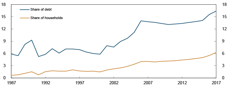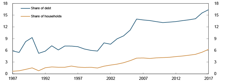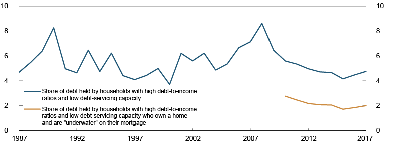 Chart 1.6 Debt held by vulnerable households1. Share of total household debt. Percent. 1987 – 2017