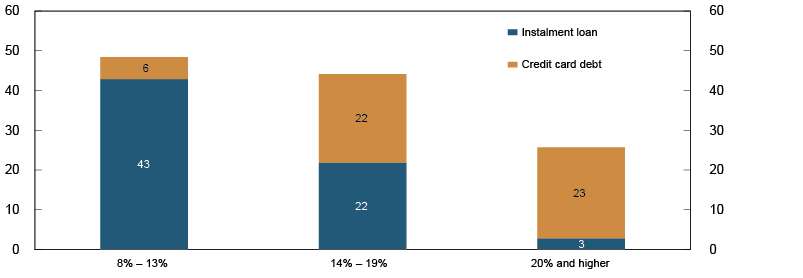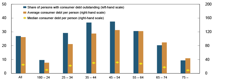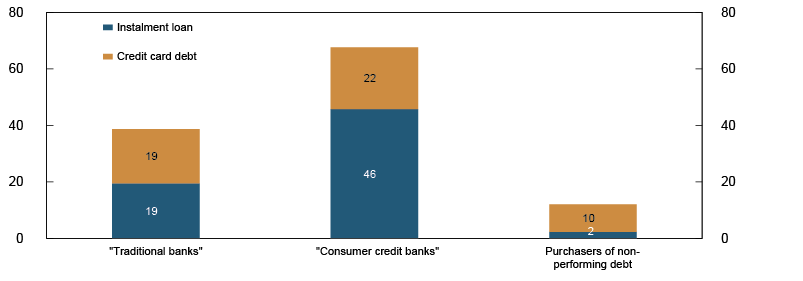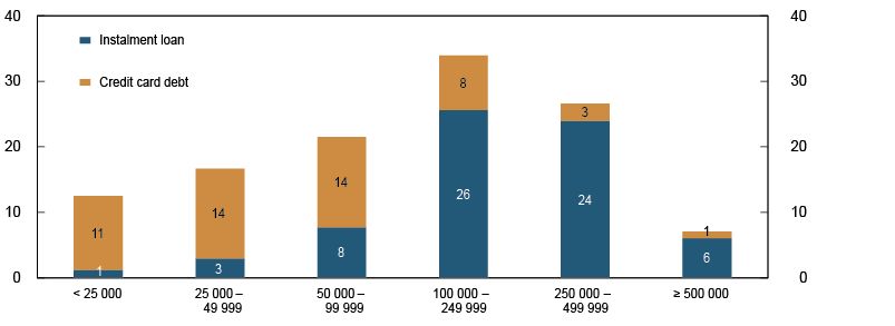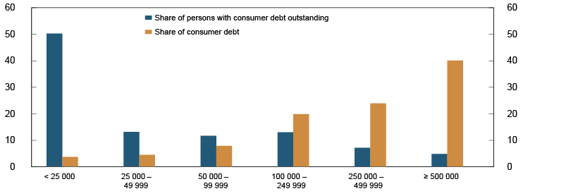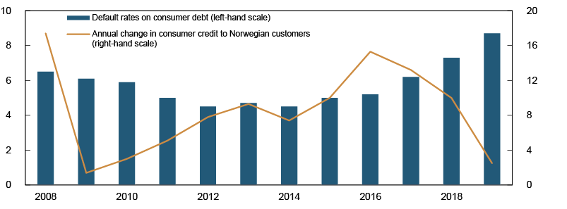 Consumer debt accounts for only 3%-4% of total household debt. Households with large consumer debt are therefore faced with high interest burdens owing to the high interest rates and consumer credit. Default rates on consumer debt are high and rising (Chart 1.8). More restrictive credit standards and reduced house price inflation may result in increased defaults among persons needing to refinance maturing consumer debt. Information from the new credit registers shows that there are many with little consumer debt, while relatively few owe large amounts (see "Credit register data show uneven distribution of consumer debt"). Growth in consumer credit to Norwegian households has long been high and rising, but has slowed since peaking in 2016.3 Lower growth reflects in part the introduction by the authorities in recent years of a number of measures to regulate consumer credit.4 The consumer credit regulation and credit registers may curb consumer credit growth further.