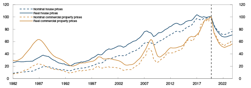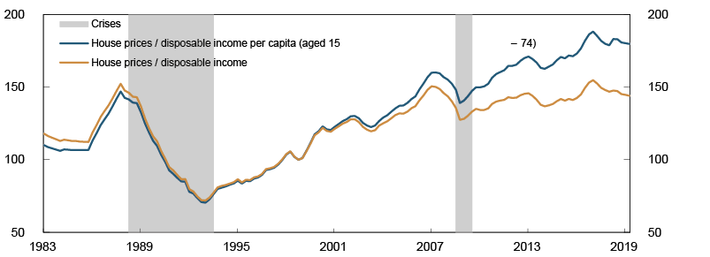House prices have risen sharply over a long period and in nominal terms are at historically high levels. Over the past two years, the rise has been moderate, and house prices relative to household disposable income have moved lower (Chart 1.9). The cooling-off of the housing market has reduced the risk of a sudden and more pronounced price fall further out, and vulnerabilities have declined somewhat since the 2018 Report.