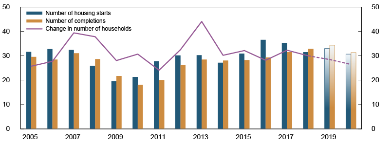 The recent moderate house price inflation may partly reflect increased residential construction.5 There was a record number of completions in 2018, and a new peak in the number of completions is expected in 2019 (Chart 1.10). Higher interest rates and the tightening of the regulation on new residential mortgage loans have also likely pulled down house price inflation.