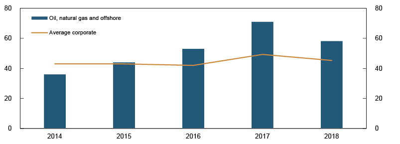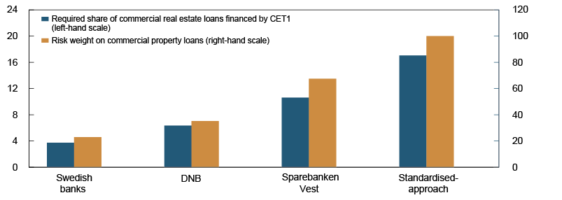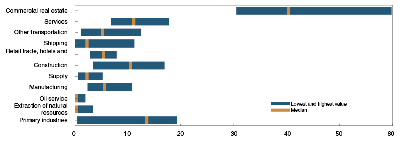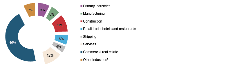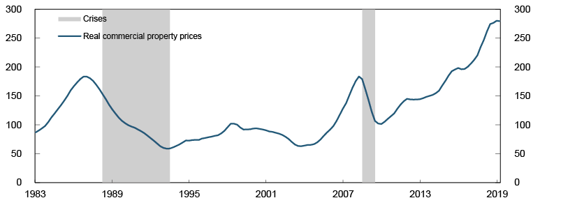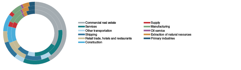 Vulnerabilities associated with high commercial property prices are broadly unchanged since the 2018 Report. In recent years, the rise in prices for commercial property in Oslo has been high, and real estate companies’ debt has risen. This has contributed to higher vulnerabilities for banks. Norwegian banks’ have sizeable exposures to commercial real estate (CRE) (see Section 3 Stress test). Even though in normal times, losses have been historically been low, CRE is the sector that has inflicted the most losses during crises.