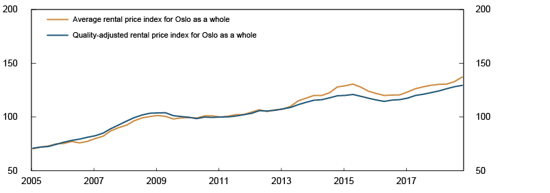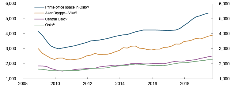 In isolation, rising rental prices strengthen the debt-servicing capacity of CRE companies. Rents for prime office space in central Oslo have risen sharply over the past few years (Chart 1.12). In other parts of Oslo, average rental prices have risen, but the rise has been lower than for prime office space. Norges Bank has developed a rental price index that takes into account that rent depends on the attractiveness of the office space (see "New rental price index for commercial real estate in Oslo"). This quality-adjusted index confirms that rents for the most attractive office space have risen more sharply in recent years than what could be considered representative for Oslo. According to Entra’s consensus report, market participants expect rents to continue to rise in Oslo, though at a slower pace than in 2019.
