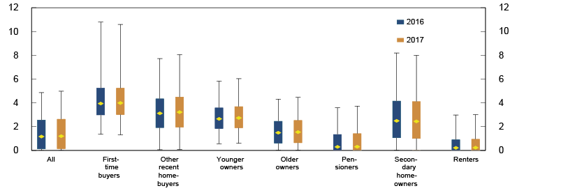 The latest available data at individual level show an increase in the share of highly leveraged households (debt above five times gross income) and low debt-servicing capacity (annual margin below one month’s income) between 2016 and 2017 (Chart 1.6). Especially among first-time buyers, there was a large share that assumed debt corresponding to a debt-to-income (DTI) ratio of above five in 2017 (see "Higher share of highly leveraged households"). DTIs also rose for households that were not active in the housing market, many of whom experienced a fall in income. The share of households “underwater” (net debt higher than their dwelling’s market value) was broadly unchanged. The data suggest that the number of vulnerable households increased between 2016 and 2017. Since then more moderate credit growth and house price inflation has been observed, which may indicate a slowdown in the build-up of vulnerabilities.