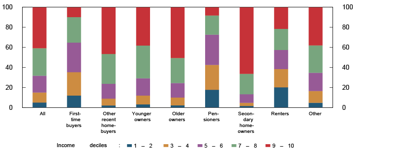 Interest burdens, ie the share of income used to service interest on debt, are historically low owing to low lending rates (Chart 1.7). After the interest rate hikes over the past year, interest burdens have risen slightly. Owing to high debt levels, interest rate increases have a greater impact on household interest burdens than before. Debt service ratios, ie the share of income used to service interest and normal principal repayments, are already high and at the same level as prior to the financial crisis in 2008 and the banking crisis in the 1990s. Debt service ratios signal high risk in the heatmap (see "Developments in the heatmap").