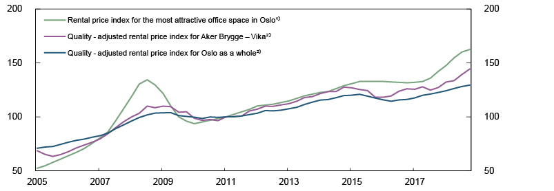 Estimated real selling prices for prime office space in Oslo have been rising sharply over several years (Chart 1.11). Over the past year, the rise has been more moderate. Selling prices are estimated using rental prices and an estimated yield.