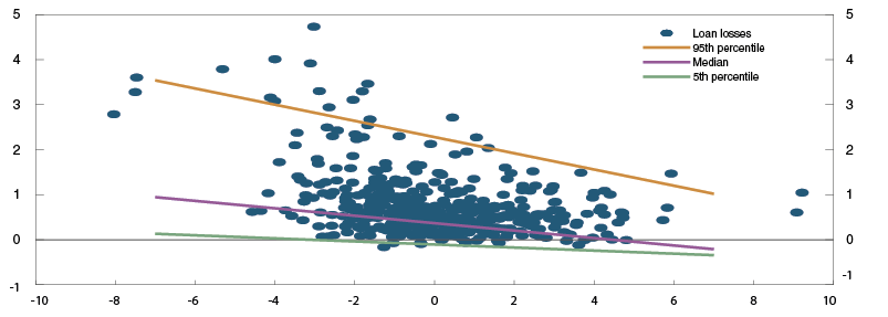 High house prices are a key financial system vulnerability in Norway. Sharp and sudden declines in house prices may trigger tightening of household consumption and result in increased losses on banks’ loan portfolios. The covered bond market may also be weakened. This may create bank funding shocks (see Section 2 Bank profitability, solvency and funding).