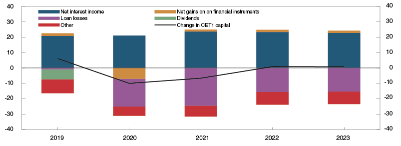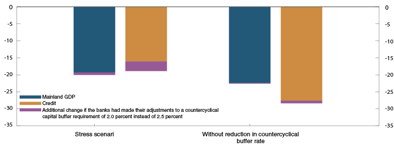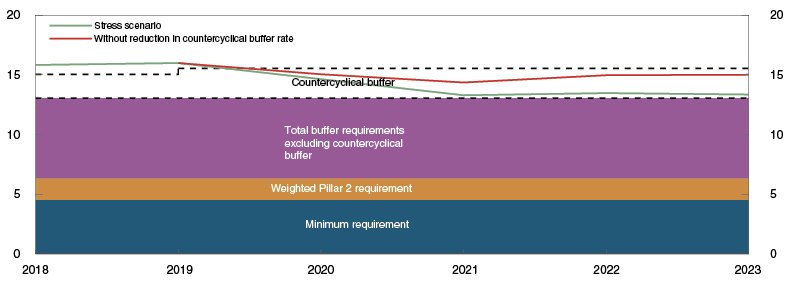 Banks’ loss absorbency capacity in an economic downturn is important for financial stability. Banks’ capital and liquidity requirements have become considerably stricter following the financial crisis. The stress test in this Report shows that the capital buffers of the largest Norwegian banks as a whole are sufficient to absorb the losses associated with a hypothetical downturn in the Norwegian economy. Nevertheless, in such a situation, banks may still tighten lending, which may amplify the downturn. To counter a sudden fall in lending, the authorities can reduce the countercyclical capital buffer and allow banks to draw on the remaining buffers. In that case, banks should be given sufficient time to rebuild the capital buffers.