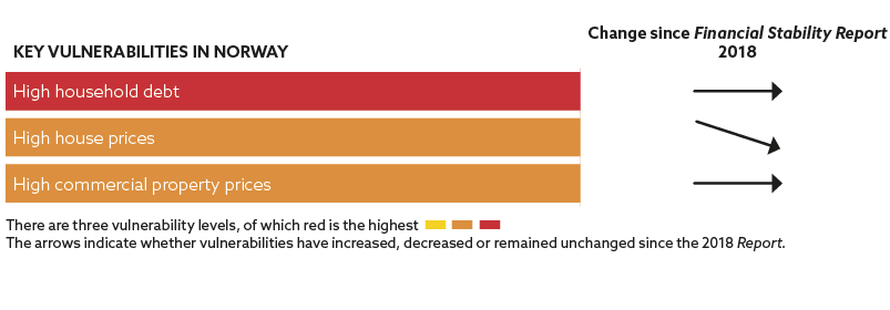 The key vulnerabilities in the financial system in Norway are high household debt, high house prices and high commercial property prices (see "Key financial system vulnerabilities in Norway"). Vulnerabilities have not changed substantially since the 2018 Report.