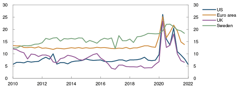 1 Period: 2010 Q1 – 2022 Q1. Saving as a share of household disposable income. Data up to 2022 Q1 for the US and 2021 Q4 for the euro area, the UK and Sweden.