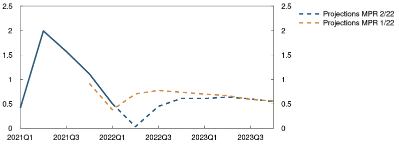 2 Period: 2021 Q1 – 2023 Q4. Projections from 2022 Q1 for MPR 1/22 and from 2022 Q2 for MPR 2/22. Export weights. 13 trading partners.