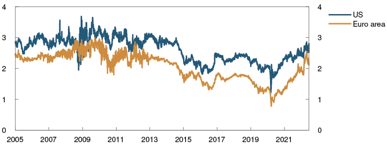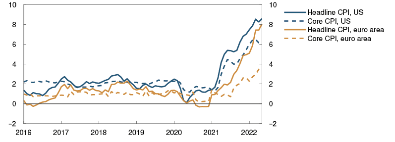 3 Period: January 2016 – May 2022. Core CPI is consumer prices excluding energy and food in the US and consumer prices excluding energy, food, tobacco and alcohol in the euro area.
