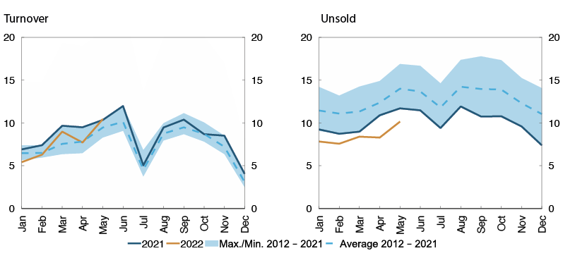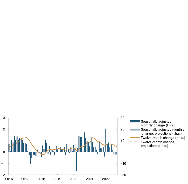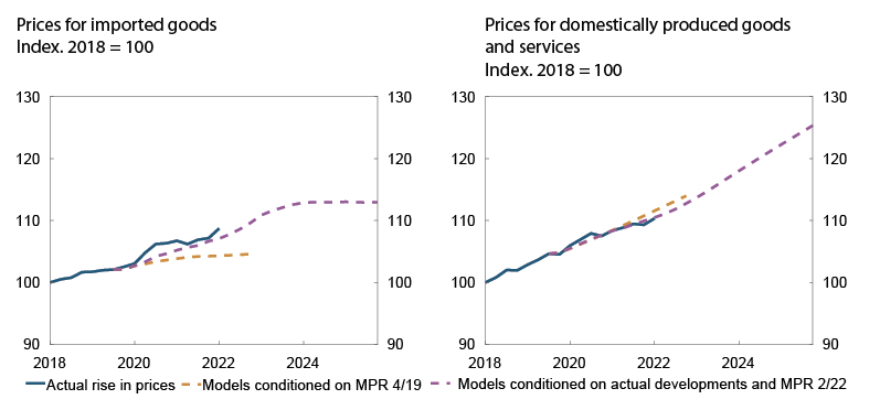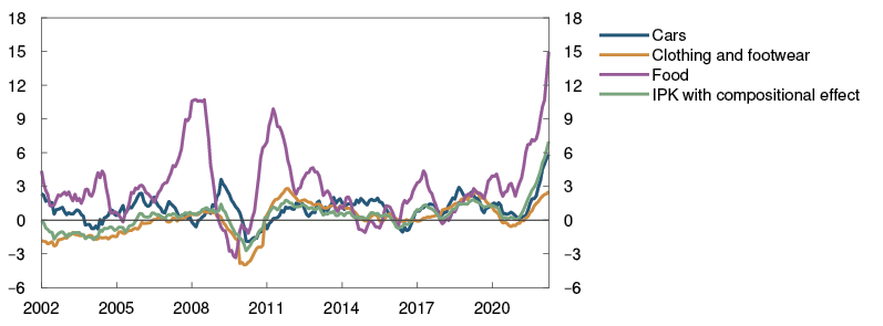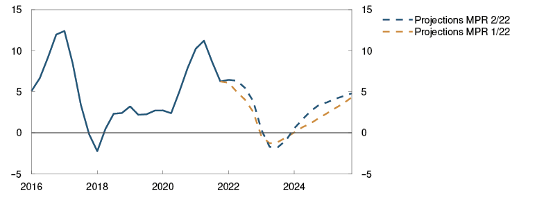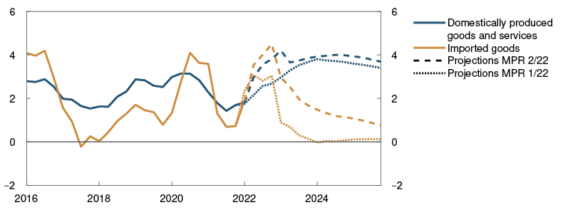 Producer price inflation for consumer goods imported to Norway (IPK index), in foreign currency terms, has been higher than expected. In recent months, the 12-month rise has moved up for all sub-indices (Chart 1.4). The rise in food prices has been particularly steep. The war in Ukraine will likely contribute to keeping food prices high ahead. The projections for 2022 and 2023 have been revised up considerably from the March Report (Annex Table 1).