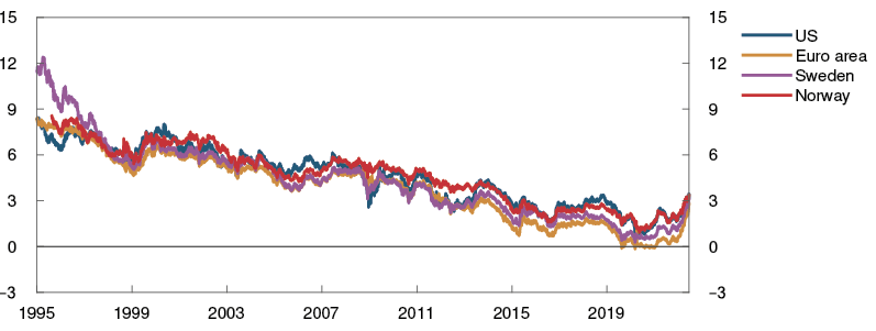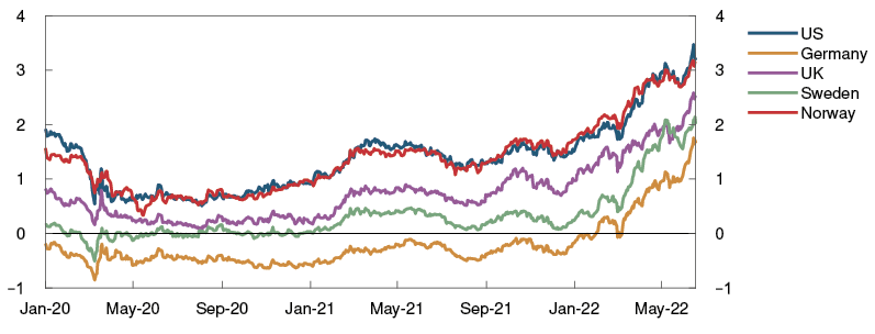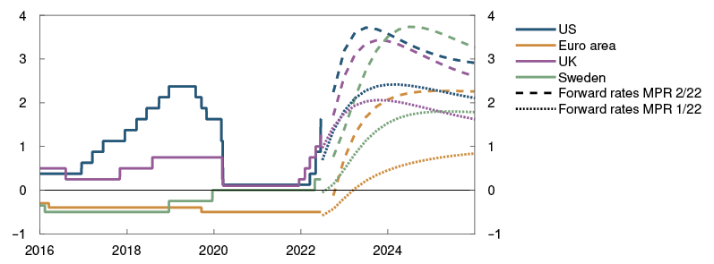Rapidly rising inflation and concerns that wage and price inflation may remain high ahead have led central banks to tighten monetary policy more than envisaged by market participants in March. Since the March Report, the US Federal Reserve and the Bank of England have raised their policy rates by 1.25 and 0.75 percentage points respectively to 1.5% and 1.25%. The central bank of Sweden has raised its policy rate from 0% to 0.25%, while the European Central Bank has signalled that its first policy rate increase will be in July. Central banks are signalling further tightening ahead, and market rates show that policy rate expectations have risen markedly since the March Report. Long-term government bond yields have largely tracked policy rate expectations.