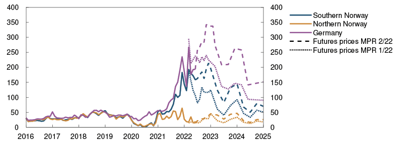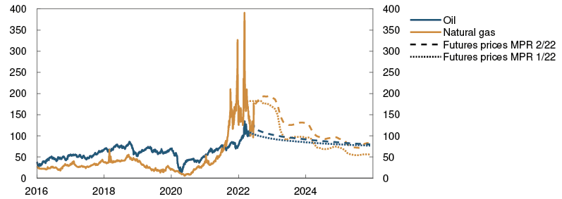 Prices for refined oil products have increased more than crude oil prices since the March Report. This is because of the recovery in the consumption of refined products, low inventories, low production capacity in the refineries sector and reduced exports of refined products from Russia as a result of sanctions. Global wholesale petrol prices measured in USD have increased by about 30% and diesel prices by 25%. Although futures prices indicate that wholesale petrol and diesel prices are expected to fall ahead, they are considerably higher now than at the time of the March Report.