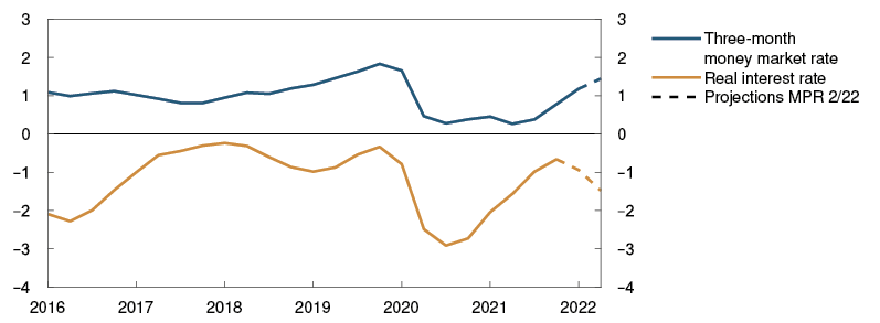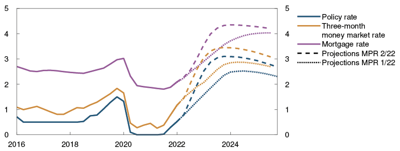 The krone has depreciated and is weaker than projected. Norwegian money market premiums have declined. Norwegian market rates have moved up, reflecting expectations of further policy rate rises through the year. The rise in residential mortgage rates has been approximately as expected.