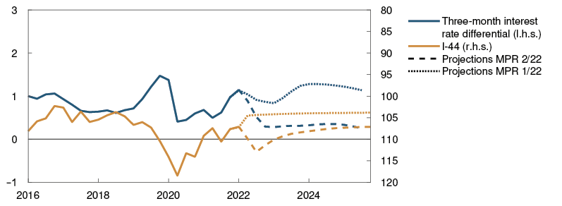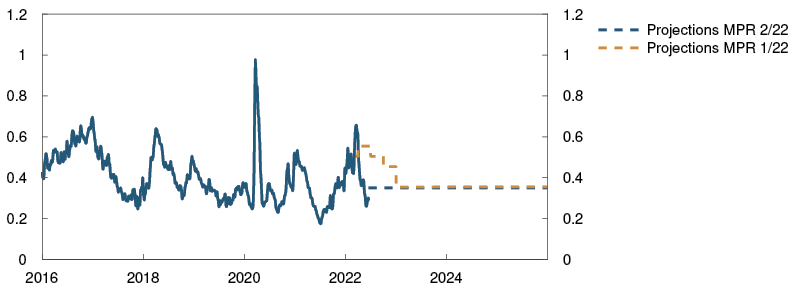 The upswing in economic activity among Norway’s trading partners in 2022 Q1 was approximately in line with expectations. Headline inflation is still on the rise in many countries, and the projections for underlying inflation have been revised up. High inflation lowers household purchasing power. The projections for trading partner GDP growth in 2022 and 2023 have been revised down. The war in Ukraine is contributing to continued high oil and gas prices and volatility in global financial markets. Market rates indicate higher policy rate expectations abroad compared with the March 2022 Monetary Policy Report.