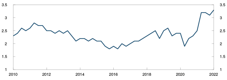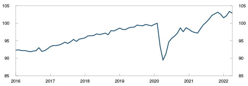 Economic activity among Norway’s trading partners continued to rise broadly as expected in 2022 Q1. Labour market conditions have continued to improve, and unemployment has returned to pre-pandemic levels in many countries. Wage growth is on the rise and has been higher than projected in the March Report.