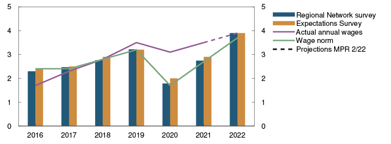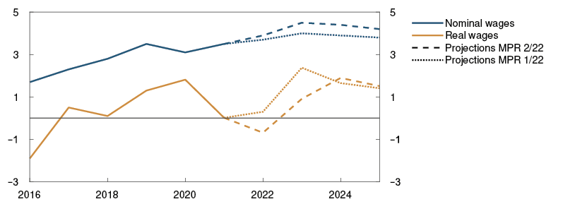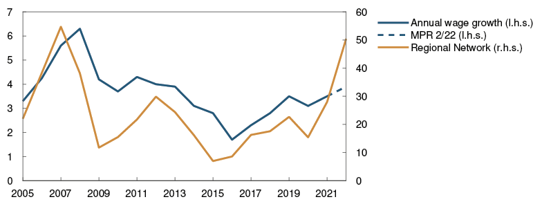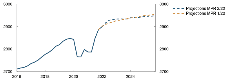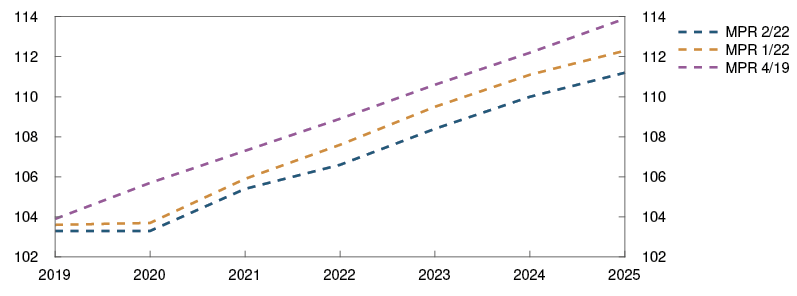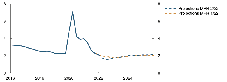 This year’s wage settlements so far appear to be consistent with the wage growth projection in the March Report. Nevertheless, a tight labour market may result in somewhat faster wage growth than projected earlier. Annual wage growth in 2022 is now projected at 3.9%, which is higher than in March. The projection for wage growth is in line with the wage expectations of the social partners and Regional Network contacts.