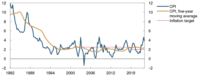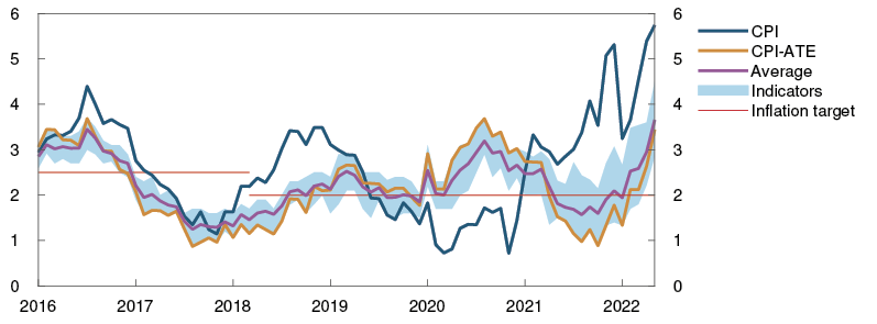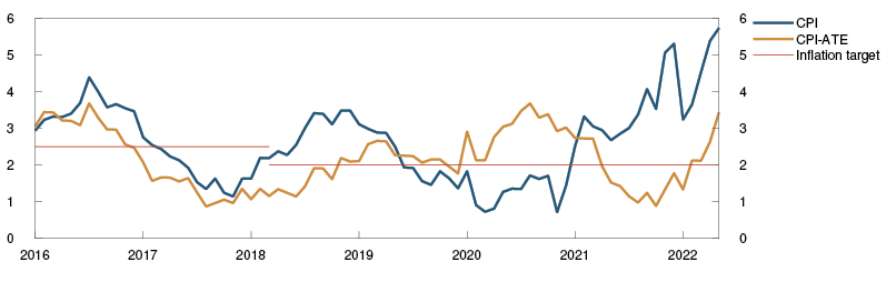 Inflation in Norway has climbed further. The 12-month rise in the consumer price index adjusted for tax changes and excluding energy products (CPI-ATE) was 3.4% in May, which was higher than projected. The increase in CPI-ATE inflation appears to be broad-based. Prices for both imported goods and domestically produced goods and services have risen more than projected. Wage growth is on the rise, and producer prices for imported goods have increased more than expected. In conjunction with the krone depreciation, this will push up inflation ahead.