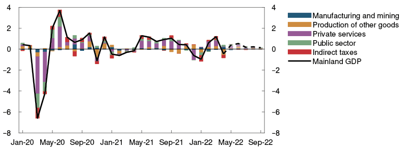 Economic activity has picked up quickly following the decline caused by the Omicron wave in winter. Mainland GDP was a little lower in April than projected in the previous Report. At the same time, there was strong growth in the sectors that had been most affected by pandemic-related restrictions. Household consumption has risen further and has been a little higher than projected. Services consumption moved up quickly through spring and is now back at pre-2020 levels, while demand for goods has been higher than expected.