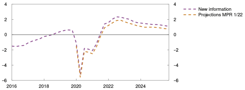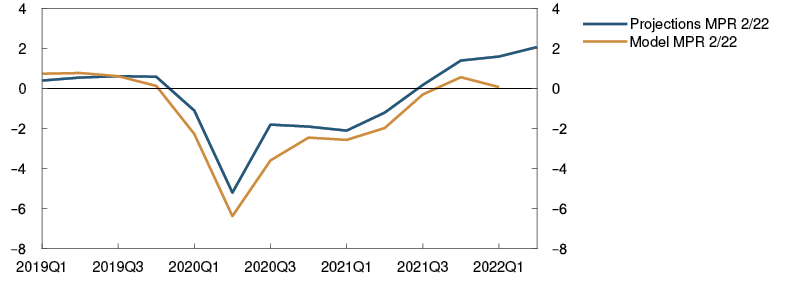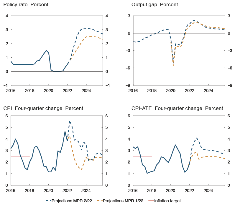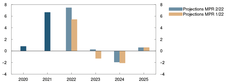 Percentage change from projections in Monetary Policy Report 1/22 in brackets |