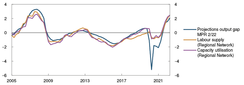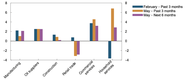 Employment has continued to rise, and the labour market is tight. In May, Norges Bank’s Regional Network contacts reported growing shortages of labour and intermediate goods. Contacts expected activity growth to slow somewhat over the next six months, with many citing capacity constraints as the reason for the slowdown. The share of contacts reporting capacity problems and output constraints due to labour shortages is now just as high as around the cyclical peak preceding the financial crisis. Strong demand for labour is confirmed by the high number of job vacancies. Seasonally adjusted unemployment fell to 1.7% in May, which is lower than projected in the March Report.