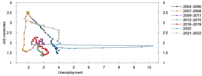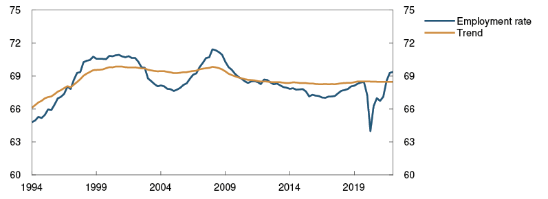 Activity in the Norwegian economy is high, with little spare capacity. Activity has picked up quickly following the decline owing to the Omicron wave in winter. Unemployment has declined more than expected in the March 2022 Monetary Policy Report and is at a very low level.