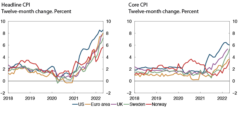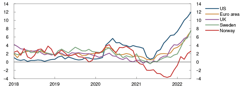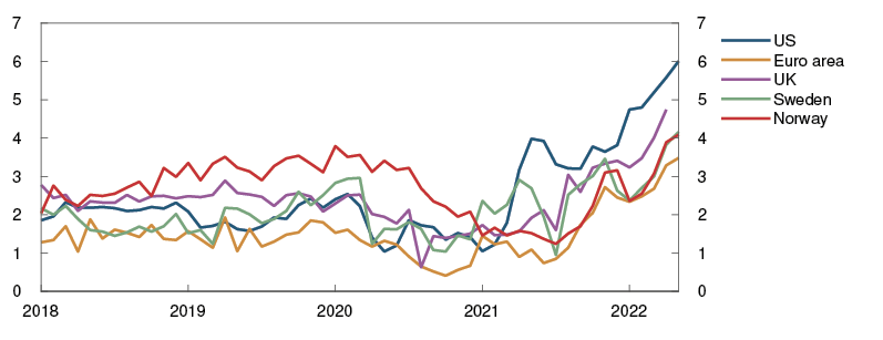 Over the past year, pandemic-related supply and demand conditions have contributed to a marked rise in inflation among Norway’s main trading partners. In spring, the war in Ukraine contributed to high commodity prices. The 12-month rise in the headline consumer price index (CPI) moved up to over 8% in the US and euro area in spring (Chart 1.3). The rise in energy and food prices made up over half of the 12-month rise in the euro area, and underlying consumer price inflation was 3.8% in May. In the US, underlying consumer price inflation was 6% in May. In recent months, underlying inflation among all Norway’s main trading partners has been higher than projected in March.