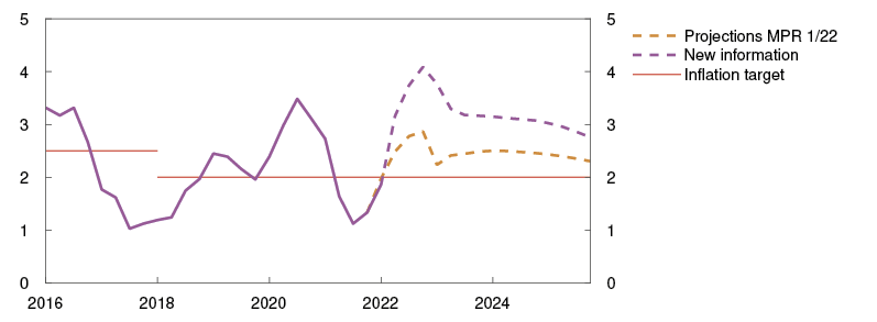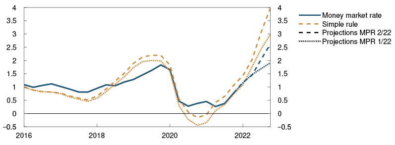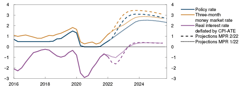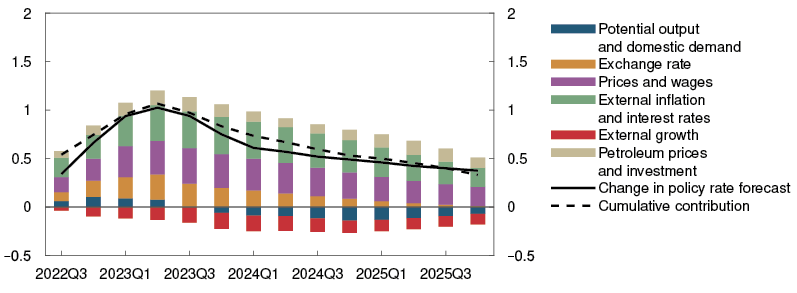 In its discussion of the balance of risks, the Committee was concerned with the risk of inflation moving higher than anticipated against the background of little spare capacity in the Norwegian economy, sustained global inflationary pressures and a weaker krone. In that case, the policy rate may be raised more than currently projected. On the other hand, there is also a risk that rapid rate increases abroad will lead to an abrupt slowdown in growth, with global inflationary pressures easing faster than assumed. The rise in interest rates in Norway may also cool down the housing market and curb household consumption to a greater extent than expected. If inflation and capacity utilisation fall faster than projected, the policy rate may be raised less than currently projected.