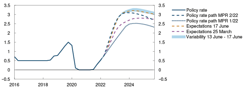 Norges Bank’s Monetary Policy and Financial Stability Committee decided to raise the policy rate from 0.75% to 1.25% at its meeting on 22 June. Based on the Committee’s current assessment of the outlook and balance of risks, the policy rate will most likely be raised further to 1.5% in August.