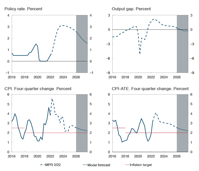 The policy rate forecast has been revised up from the March Report and indicates a rise in the policy rate to around 3% in the period to summer 2023. This is above what is estimated to be a neutral policy rate. With such a path for the policy rate, there are prospects that inflation will drift down and approach target further out. Capacity utilisation is projected to remain above a normal level in the coming years, and unemployment is projected to remain low. House price inflation and credit growth are expected to moderate.