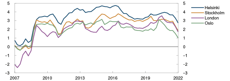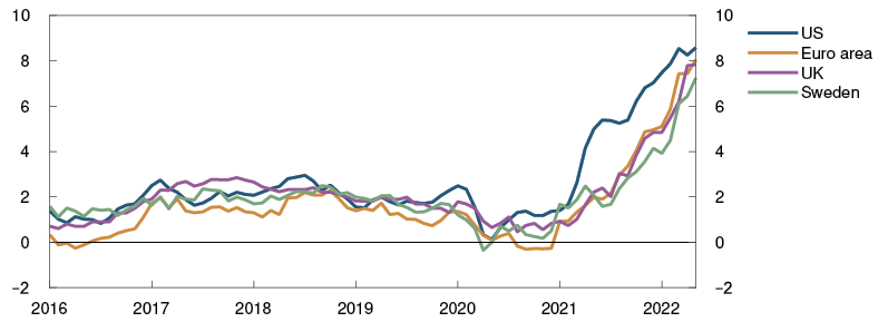 In the March Report, it was assumed that high inflation, tighter financial conditions and increased uncertainty among household and firms as a result of the war in Ukraine would curb activity and that trading partner GDP growth would slow in Q1. Overall, growth has been approximately in line with the projections in the March Report, although growth rates vary across countries. In the US and Sweden, activity fell between 2021 Q4 and 2022 Q1, while the euro area, UK and China recorded solid growth in the same period.