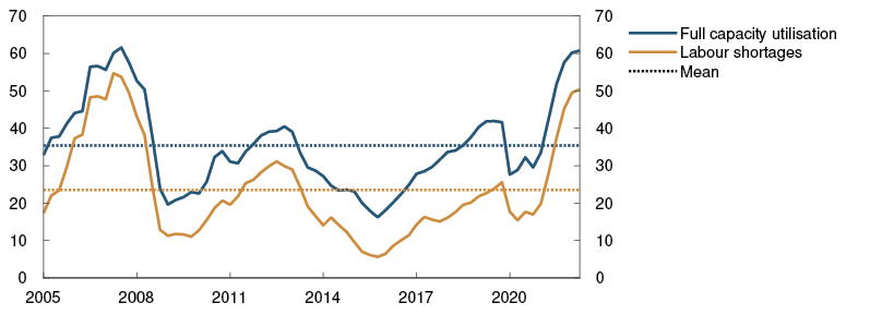 4 Period: 2005 Q1 – 2022 Q2. Share of contacts that will face some or considerable difficulty meeting increased demand and share of contacts citing labour shortages as a constraint on production. The question about labour is asked only of the enterprises reporting full capacity utilisation, but the series shows the share of all contacts included in the interview period. The local government and hospital sector is omitted from the capacity utilisation series, but is, however, included in the labour force series.