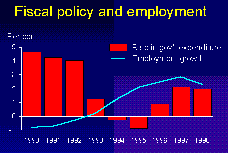 The chart shows growth rates for total employment and the central government budget's real, underlying spending growth, excluding expenditure relating to petroleum activities, unemployment benefits and interest.