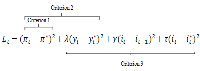 Criterion 1, which states that the inflation target is reached, is covered by the first segment, where the loss is higher the more actual inflation πt deviates from the target π*. Criterion 2, which states that for given inflation developments, the loss Lt will increase with fluctuations in economic activity, is covered by the first and second segments. Criterion 3, which states that monetary policy shall be robust, is covered by the second, third and fourth segments.